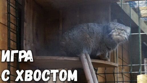 Манул Баюн играет с хвостиком после прогулки по вольеру. Зоопарк на Лампушке