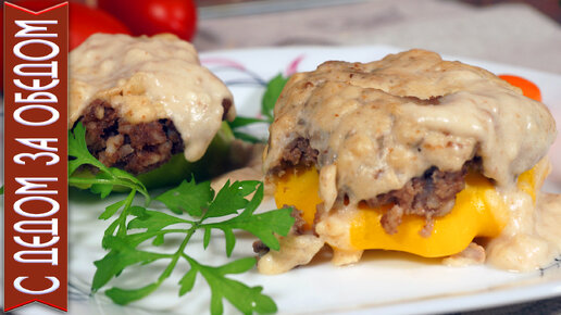 Патиссоны, фаршированные мясом и рисом под сливочным соусом.