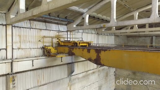 Пролет внутри производственного корпуса. Осмотр железобетонного каракаса здания и мостового крана.