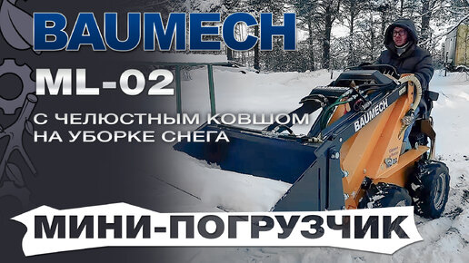 Универсальная машина мини-погрузчик Baumech ML-02 с челюстным ковшом убирает снег. Испытания