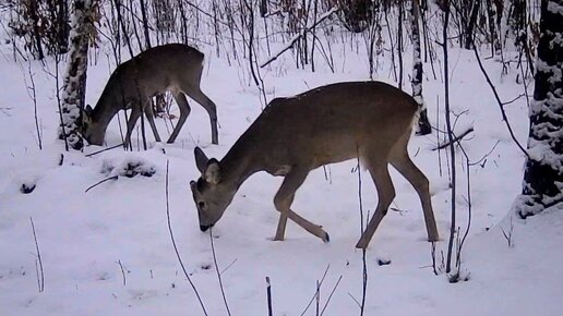 Косули ищут желуди под снегом возле дуба