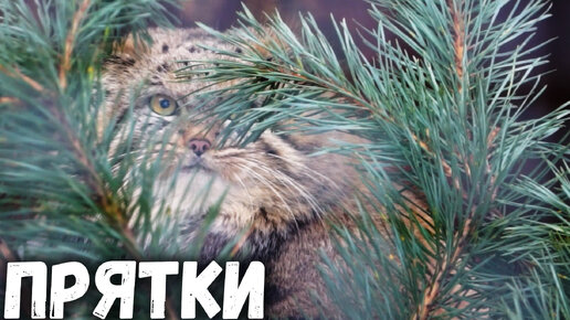 Манул Шу прячется за сосновыми ветками. Ленинградский зоопарк