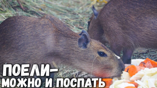 Капибары уплетают морковь, а после отдыхают в теплой траве. Ленинградский зоопарк