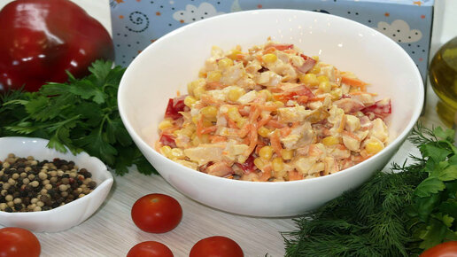 Очень вкусный и сытный салат Солнечный с копчёной курицей и корейской морковью