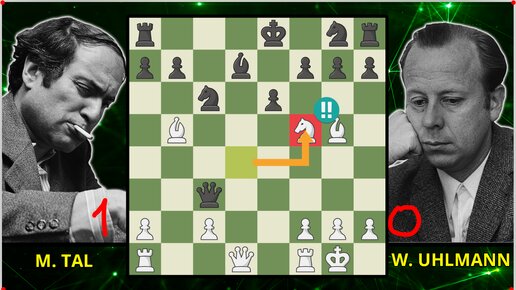 Таль вводит в шахматную науку понятие "троянский конь", эффектно, в своем стиле разворотив напрочь защиту черного короля Ульмана (Мск, 1971)