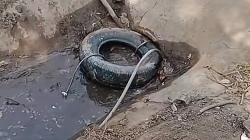 Прочистка трубы ливневки с помощью покрышки и лебедки