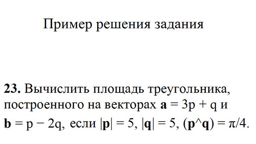Решение задачи: Вычислить площадь треугольника, построенного на векторах a=3p+q и b=p−2q, если |p|=5, |q|=5, (p^q)=π/4