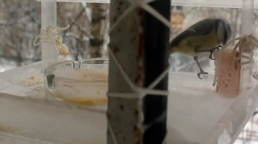 Синицы кормятся на кормушке зимой