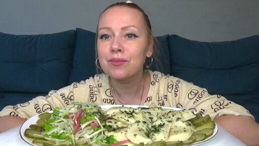 Мукбанг вареники с картошкой и сливочным маслом, салат капустный с колбасой, огурцы бочковые! Еда.