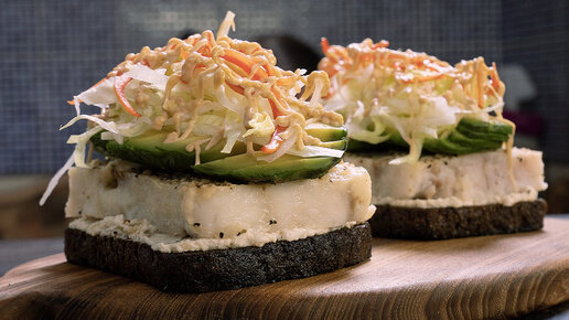 Ресторанное блюдо из доступных продуктов. Бутерброд с минтаем и авокадо