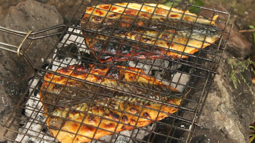 Рыба жареная на костре. Скумбрия на гриле.
