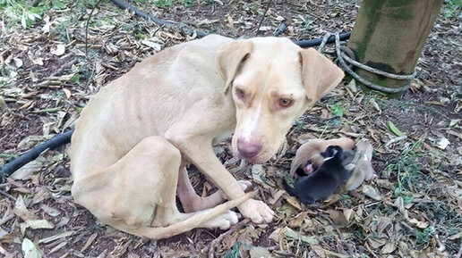 Беременную собаку бросили в лесу, "приковав" к дереву: люди обходили ее стороной, пока не родились 4 щенят, лишь тогда, еле живых их спасли