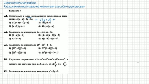 7 класс РАЗЛОЖЕНИЕ МНОГОЧЛЕНА НА МНОЖИТЕЛИ СПОСОБОМ ГРУППИРОВКИ Самостоятельная работа
