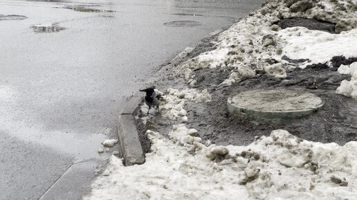 Ворона пьет из лужи зимой