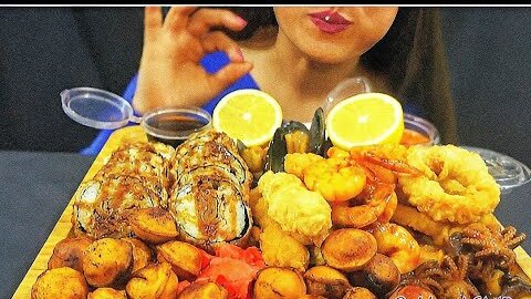 МОРЕПРОДУКТЫ АСМР МУКБАНГ✓ Креветки в темпуре✓Кальмары в кляре Мидии и осьминог