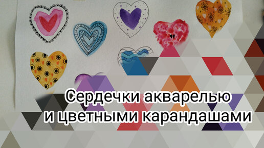 Простые интересные разноцветные сердечки "Валентинки" очень быстро акварелью и цветными карандашами