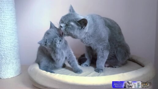 Британская кошка мать учит своего котёнка быть чистоплотным.