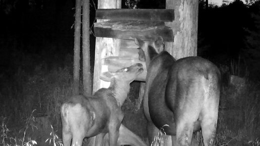 Лосиха с лосенком. Прибежал лось на солонец и издавал глухой рёв стоном. Лось выпуск 91