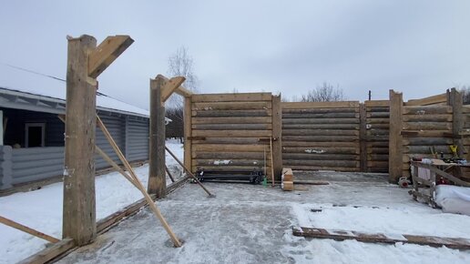 Монтаж бревенчатого навеса над бассейном..
