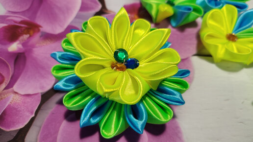 Цветок в технике канзаши для ленты в косу с бабочками. Центральный. Красивый цветок из атласной ленты 50мм своими руками.
