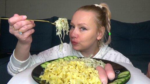 Мукбанг продолжаем ПП. Макароны с сосисками и горчицкой, капуста квашенная. Еда.