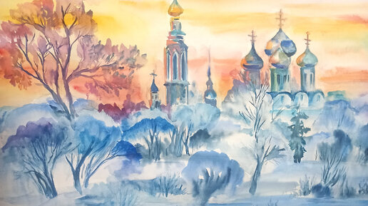 🎨🖌️🖼️💐Акварель. Рисуем зимний закат.