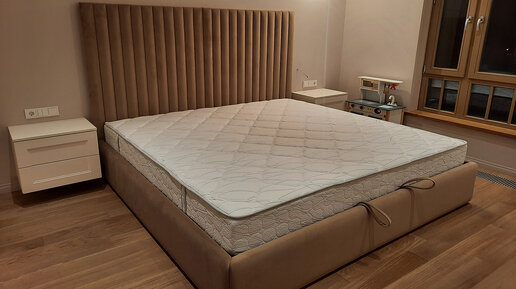 Двуспальная взрослая кровать в интерьере. Модель Страйк с узкими панелями для изголовья