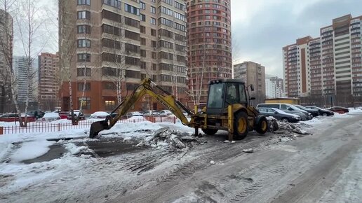 Сотрудники УК «Центрстрой» методично расчищают парковочные карманы от толстого слоя льда.