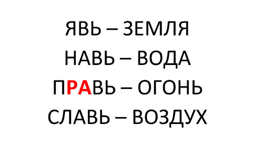 Слова «ЯВЬ», «НАВЬ», «ПРАВЬ», «СЛАВЬ». «ЗЕМЛЯ», «ВОДА», «ОГОНЬ», «ВОЗДУХ». Праязык