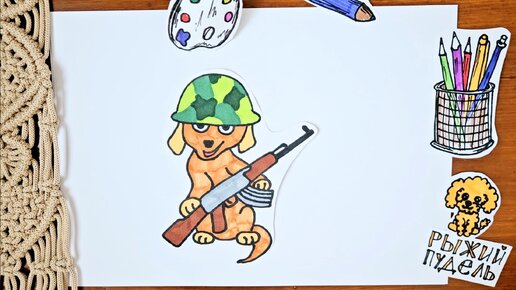 Как нарисовать ЩЕНКА в каске и с автоматом 🔫 / Рисуем открытку на 23 февраля