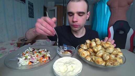 МУКБАНГ ПЕЛЬМЕНИ ЖАРЕНЫЕ / СОУС СМЕТАННЫЙ / САЛАТ ОВОЩНОЙ / ОБЖОР / EATING / Mukbang ASMR АСМР