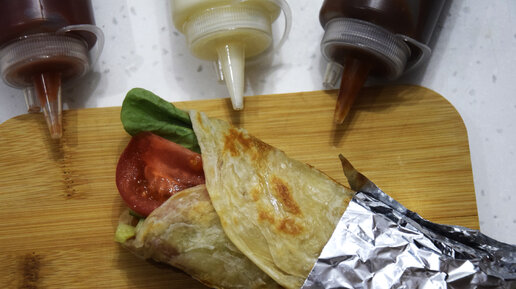 Домашняя шаурма в лепешке Роти с хрустящими куриными острыми стрипсами и сыром. Вкусный ролл с курочкой