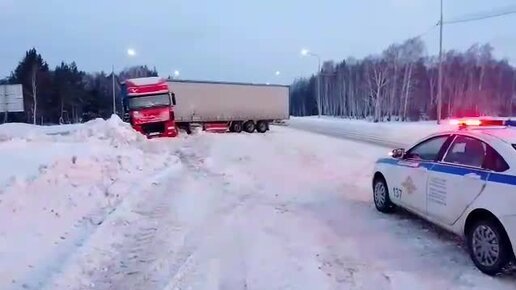 На заснеженной трассе на Урале фура зарылась в сугроб