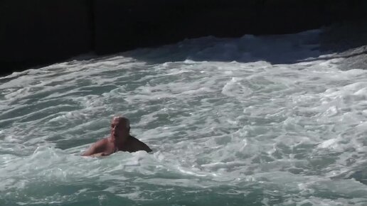 Только мужчины могут плавать при таких волнах. Кажется, мгновение и накроет водная масса отчаянных смельчаков