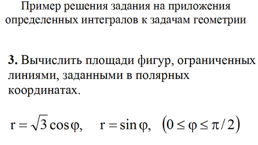 Вычислить площади фигур, заданными в полярных координатах. r=√3cosφ, r=sinφ, (0≤φ≤π/2) (Приложения определенных интегралов)