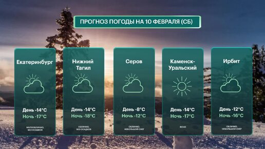 Погода в Екатеринбурге, Нижнем Тагиле, Серове, Каменске-Уральском, Ирбите в выходные 10 -11 Февраля