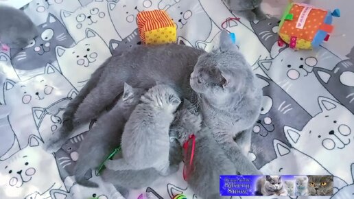 Мама и малыши. Какая идиллия. Голубые британские котята. Всё с ленточками. Возраст 1 месяц.