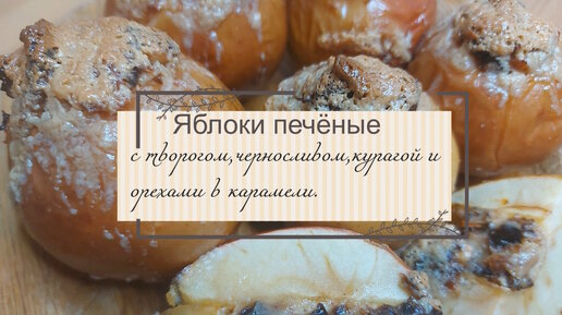 Яблоки печеные с творогом, черносливом, курагой и орехами в карамельной глазури.
