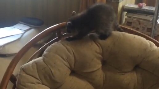 Малыш енот играет на кресле.