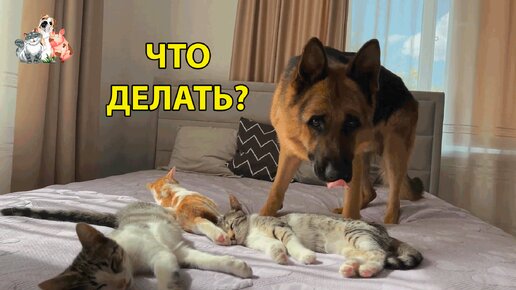 Овчарёнок с кошками на кровати 🐶 Что делать с кошками ❓🐈⬛🐈😹