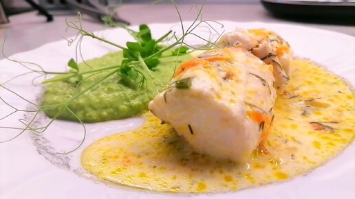 Филе судака в сметанном соусе с пюре из зелёного горошка