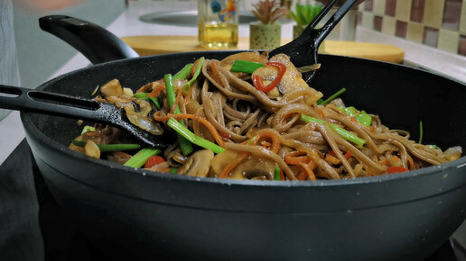 Готовлю большими сковородками. Макароны с грибами по-азиатски, вкуснейшая лапша