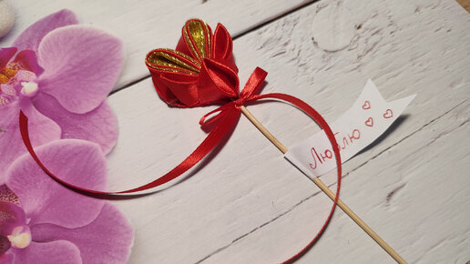 Топпер сердце в технике канзаши. 14 февраля, признание в любви. Ribbon flower/hard kanzashi. Topper. мастер-класс.
