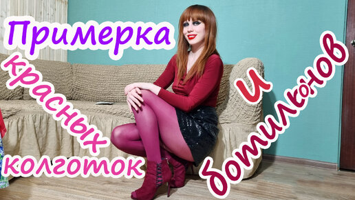 Рыжая леди в красном наряде распаковывает и примеряет красные колготки и ботильоны с открытыми носами