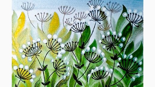 🌿🍀🌿Луг, нарисованный акварельными красками, белой гуашью и карандашами.