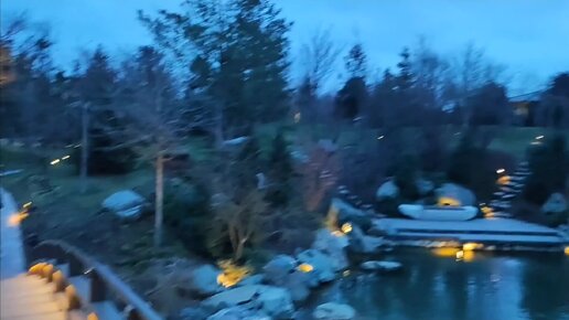 В японском саду Краснодарского парка, вечером сказочный дракон появляется в зеркальном пруду.