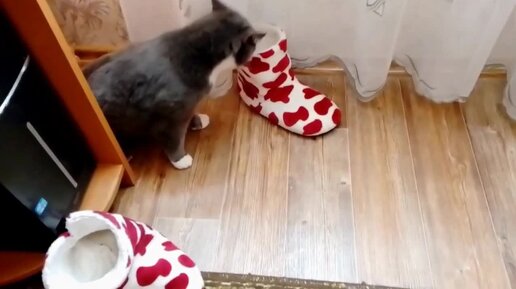 Кошка нашла сапоги. Интересно, что она будет с ними делать
