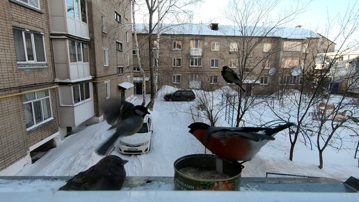 Снегири! Живые Снегири, Живой звук на кормушке! Кормушка для Птиц! Пернатые друзья!
