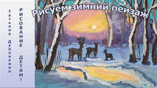 Рисуем гуашью красивый зимний пейзаж с оленями