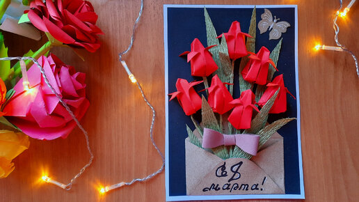 Оригинальная объёмная открытка с тюльпанами-оригами на 8 марта. Можно также подарить на День рождения, День Учителя и т.д.